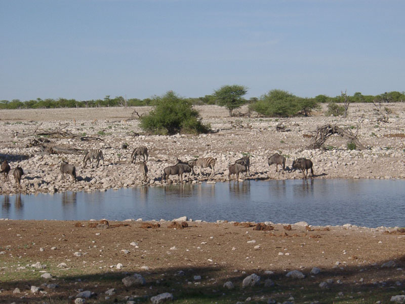 Nach den nächtlich umherschleichenden Schakalen finden sich im Morgengrauen Zebra-, Gnu- und Springbockherden ein.