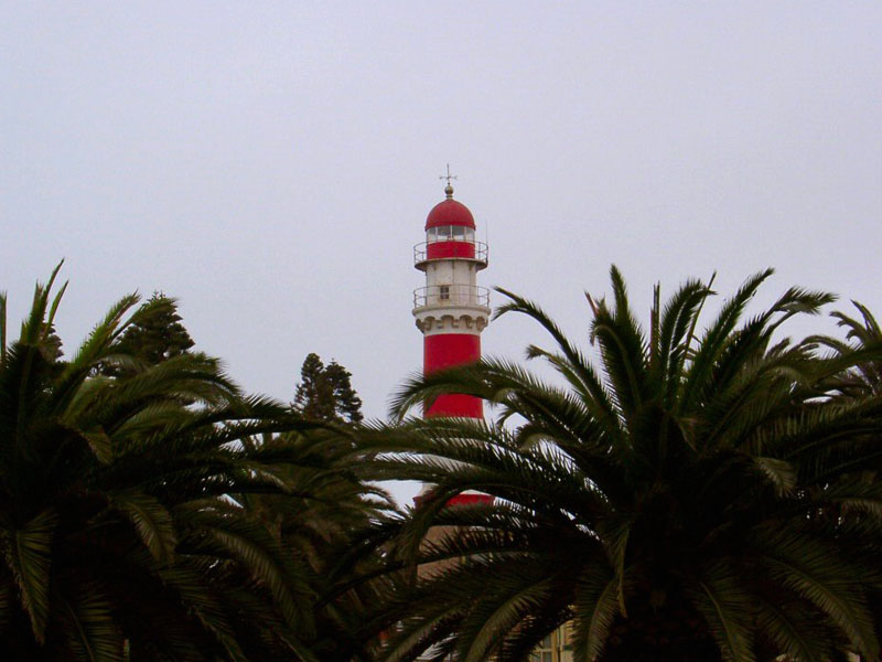 Der alte Leuchtturm von Swakopmund, Sicht von der Terrasse des Kaffee Anton. PS: Der berühmte Bienenstich war leider am Nachmittag bereits ausverkauft.